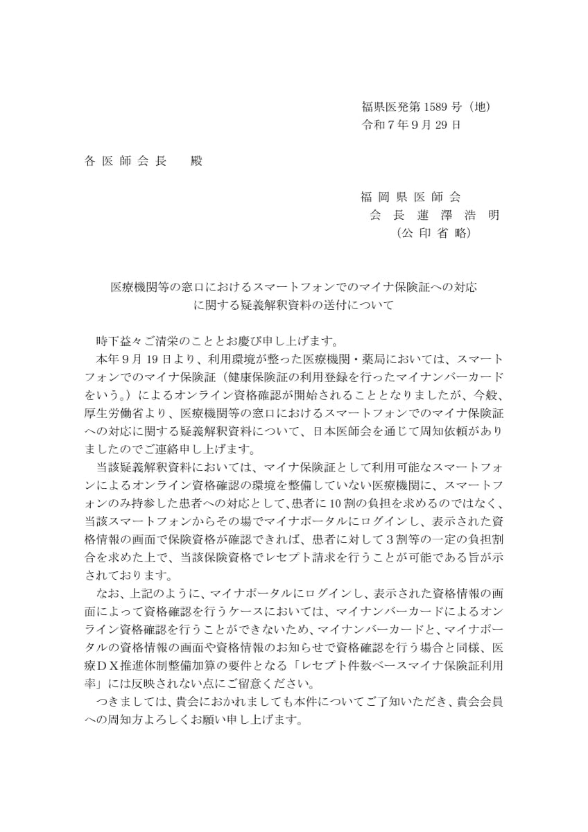 医療機関等の窓口におけるスマートフォンでのマイナ保険証への対応に関する疑義解釈資料の送付について